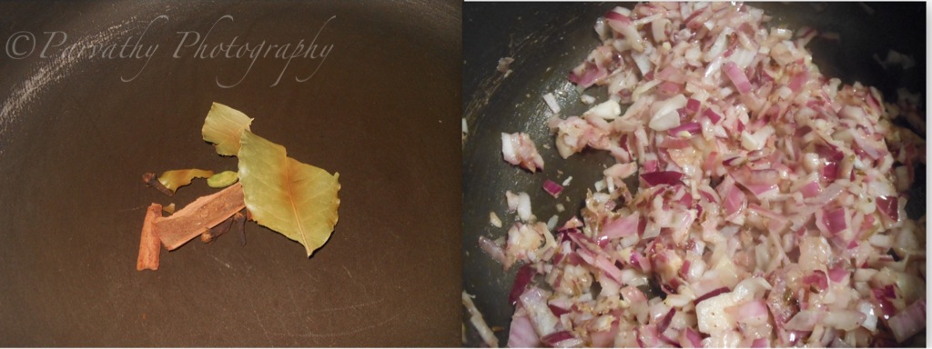 - Heat oil in a kadai/skillet add the coarsely ground masalas. Once it splutters off add onions. Fry onions until it cooks very soft. Now add ginger-garlic paste.